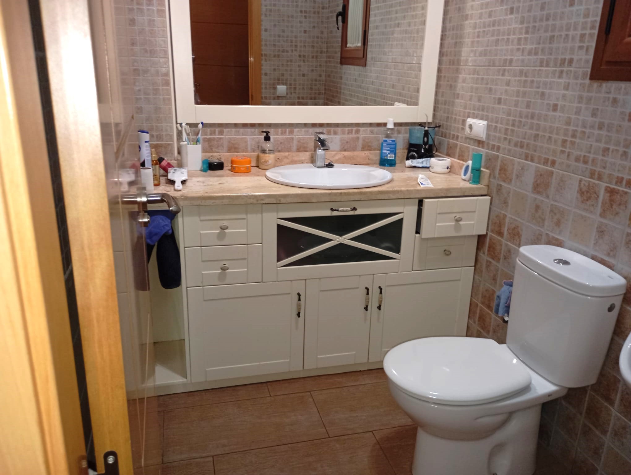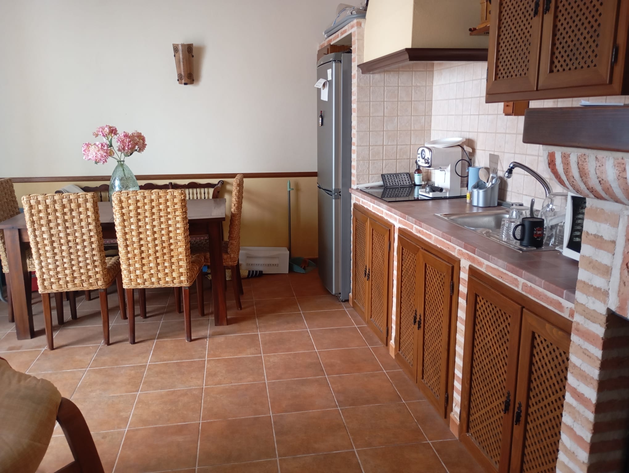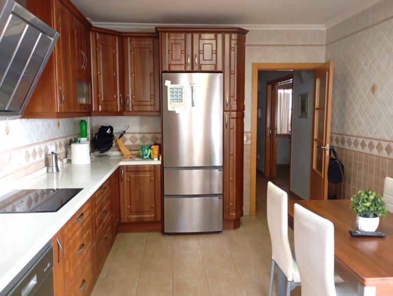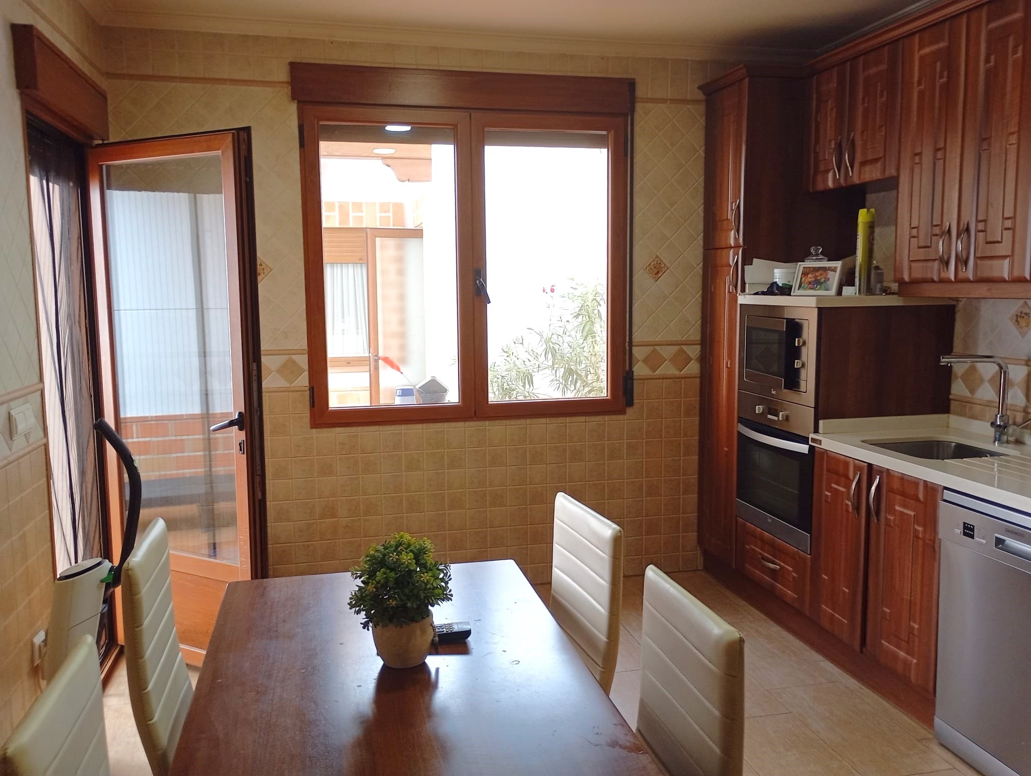 Tiene suelos porcelánicos, calefacción de suelo radiante con caldera de gasoil, ventanas climalit abatibles imitación madera y puertas de madera en pino.